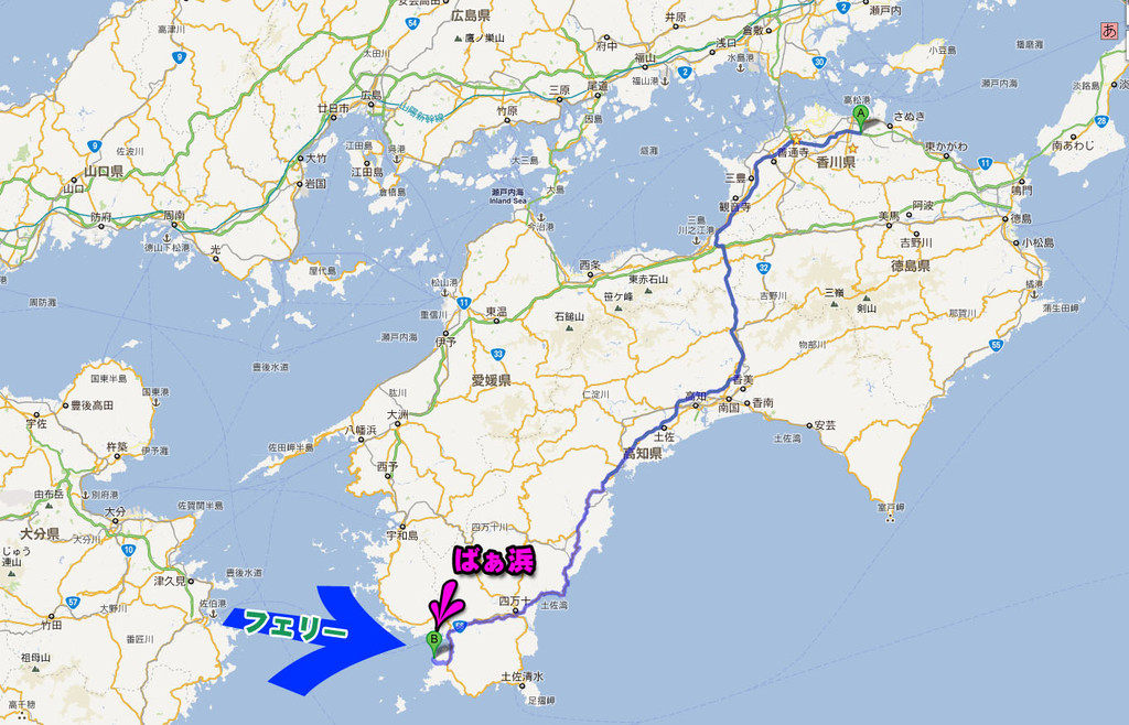 はい、九州は大分県の佐伯港からフェリーで宿毛港に渡れば